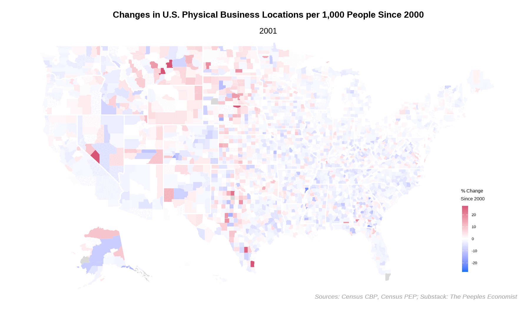 Since 1990, many counties and local areas have seen a decline in physical business locations like shops, restaurants, manufacturing plants, offices — or what economists call establishments. You can think of establishments as buildings for, say, an Old Navy or a Chick-fil-A, and Old Navy and Chick-fil-A themselves are businesses. But the total number of “establishments” doesn’t tell the full story. We also need to consider how each county’s population has changed. If more people move into a county yet the number of establishments stays the same, then there are fewer establishments per person. Since establishment counts naturally rise with population, looking at establishments per person gives us a clearer view. The map below shows how we now compare to the year 2000: