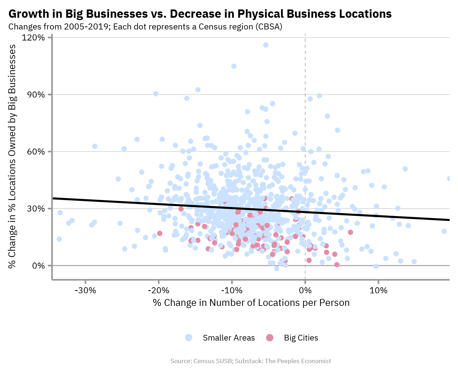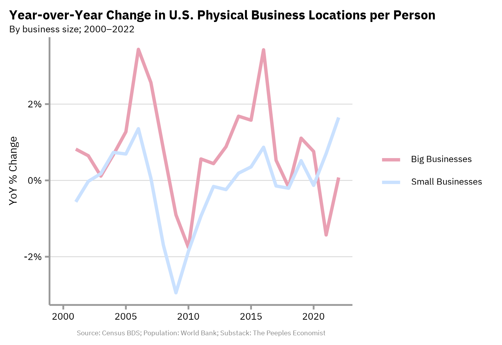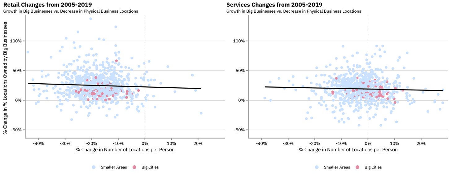 But this is actually a debated fact based on semantics of the calculation being used; another paper finds increasing local business concentration when considering the sales an establishment has in an area but decreasing local business concentration when looking at how many employees an establishment has in an area. If that’s true, then maybe our example looks more like an area where smaller stores took up much more of the economic activity in an area, but they were then pushed out by Walmart and Target.