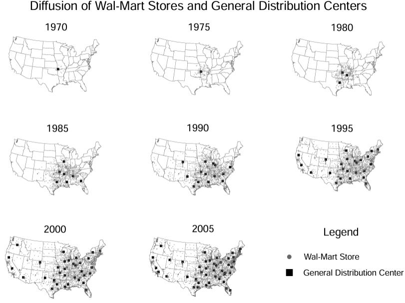 In short, information technology boosts sales and helps firms expand more efficiently, often through opening new branches across multiple counties. This helps explain why large businesses dominate so many local markets. Companies like Walmart combine logistics and data to guide their growth, strategically building stores near distribution centers to minimize transportation costs. These efficiencies made expansion cheaper, reinforcing the advantages that allowed big businesses to spread even further.